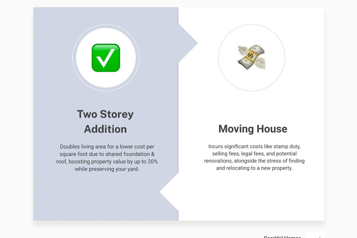 Cost: More cost-effective per square foot than single-storey additions (shared foundation and roof costs)